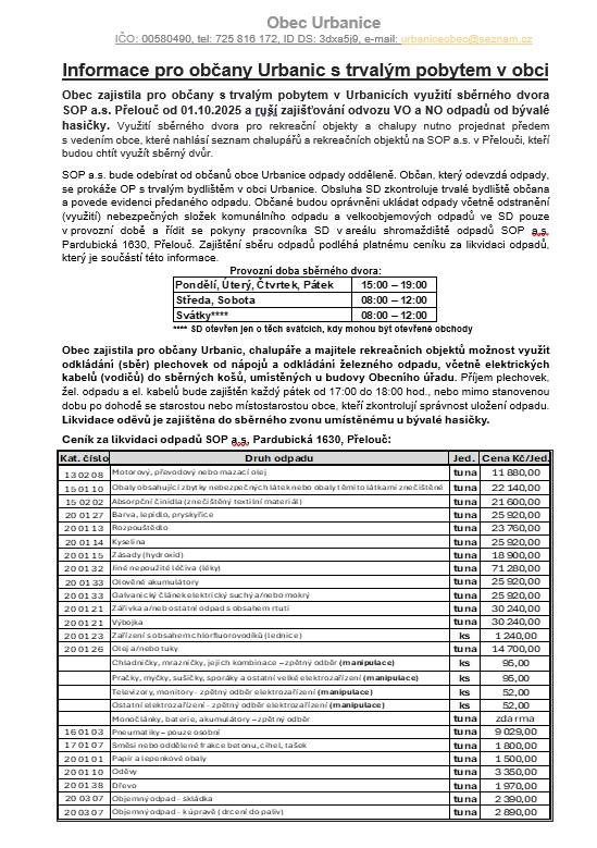 Obec zajistila pro občany s trvalým pobytem v Urbanicích využití sběrného dvora SOP a.s. Přelouč od 01.10.2025 a ruší zajišťování odvozu VO a NO odpadů od bývalé hasičky.