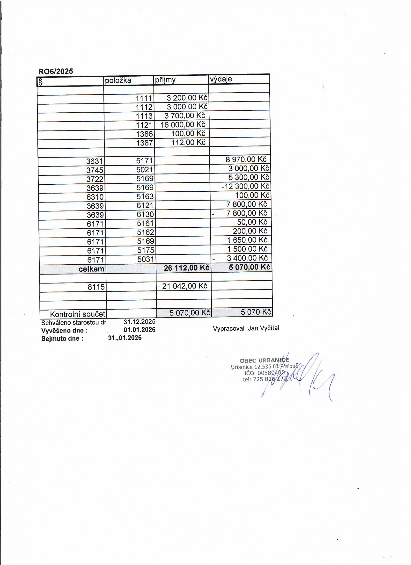 Rozpočtové opatření RO6/2025