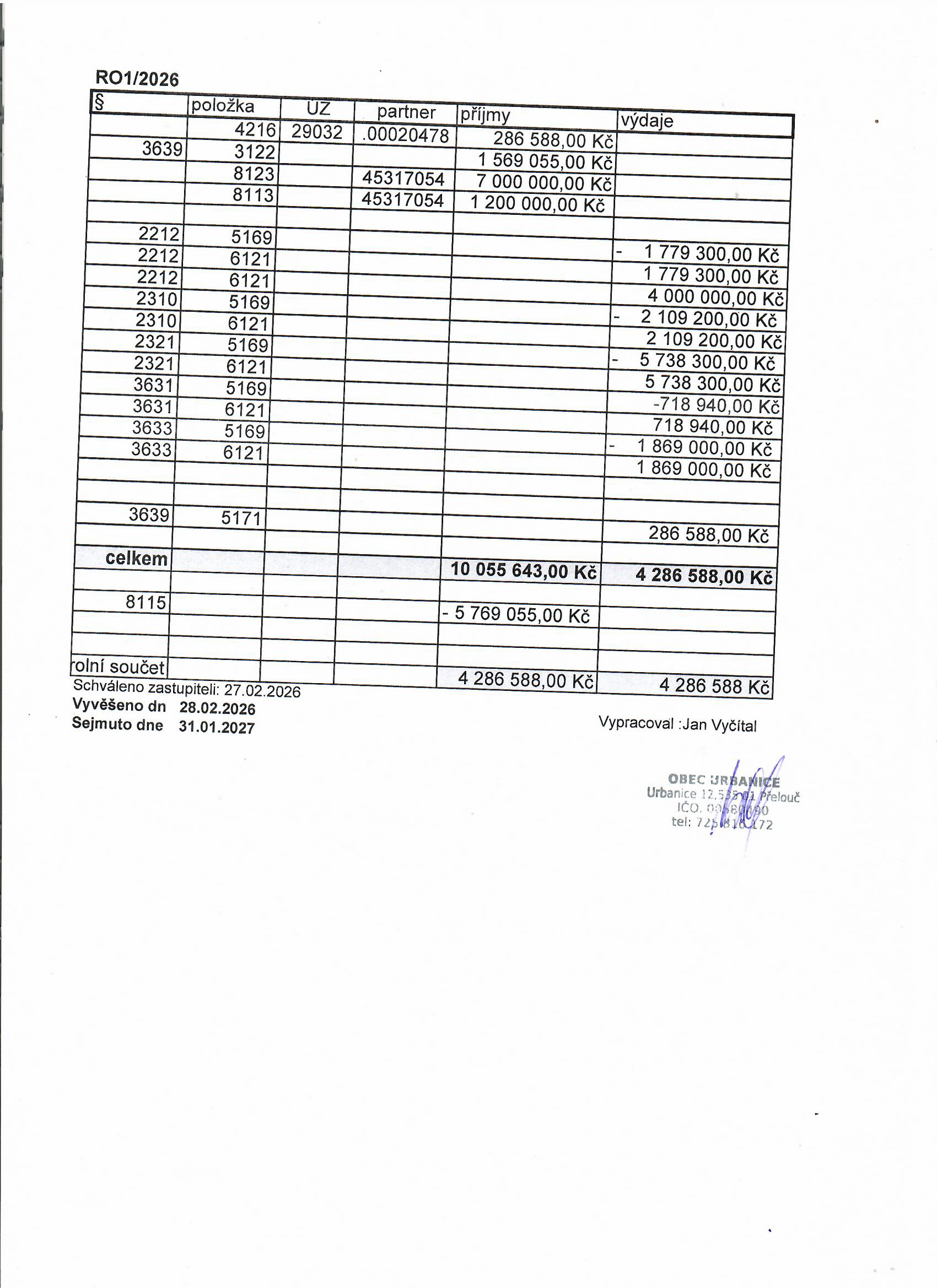Rozpočtové opatření RO1/2026