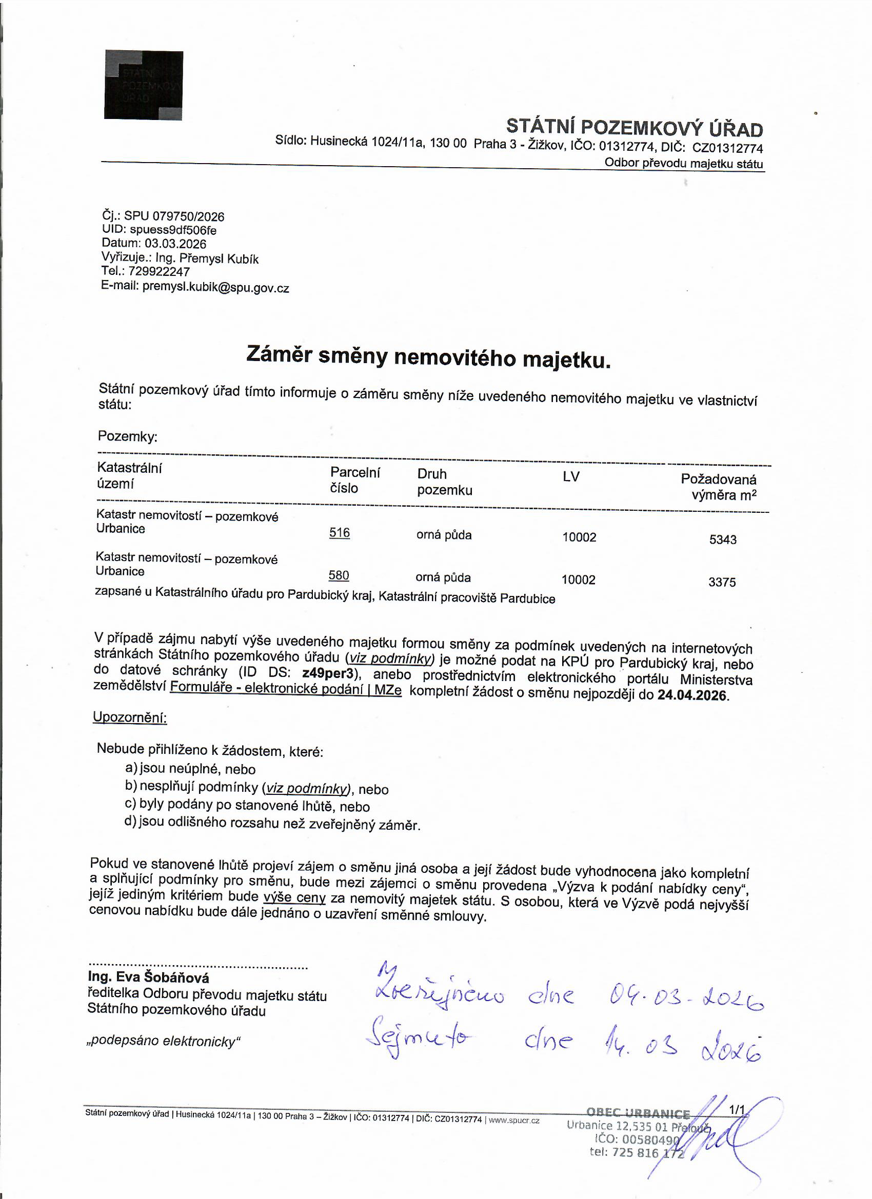 Oznámení záměru SPU na směnu pozemků p.č. 516 a p.č. 580 v k.ú. Urbanice