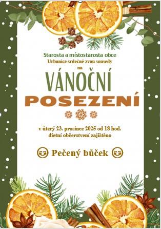 Starosta a místostarosta obce Urbanice srdečně zvou sousedy na Vánoční posezení. Dietní občerstvení zajištěno - pečený bůček.